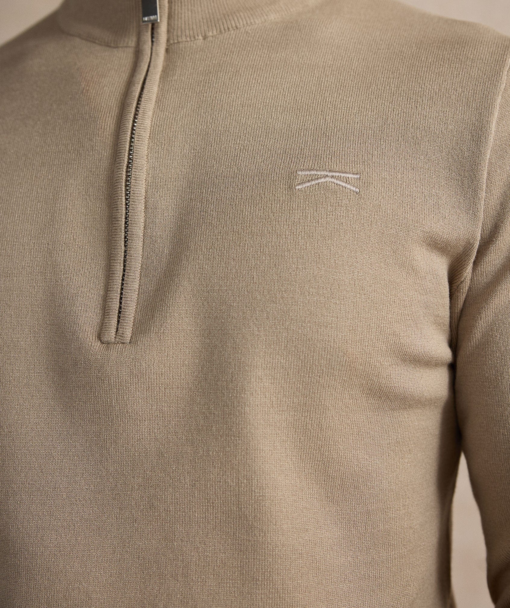 A clean half-zip layer with a soft, structured feel. The rayon-nylon blend offers smooth texture, gentle stretch, and a refined drape that holds its form through wear. A neutral, considered piece built for easy pairing with tailored or casual looks across seasons.