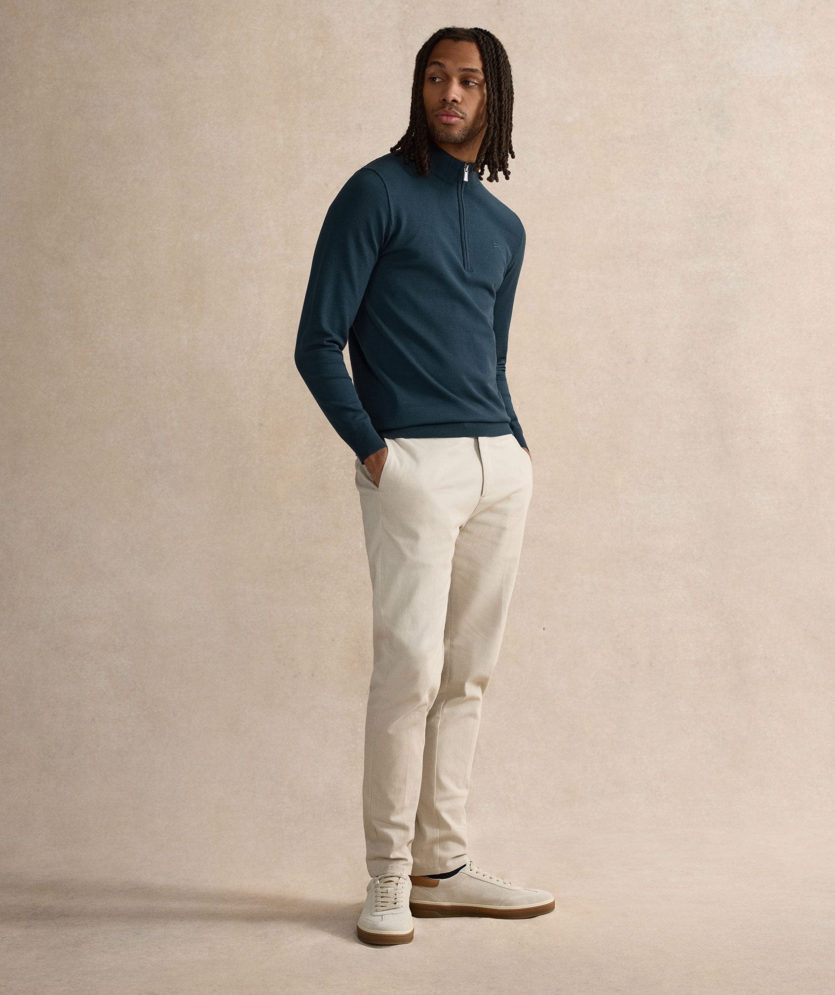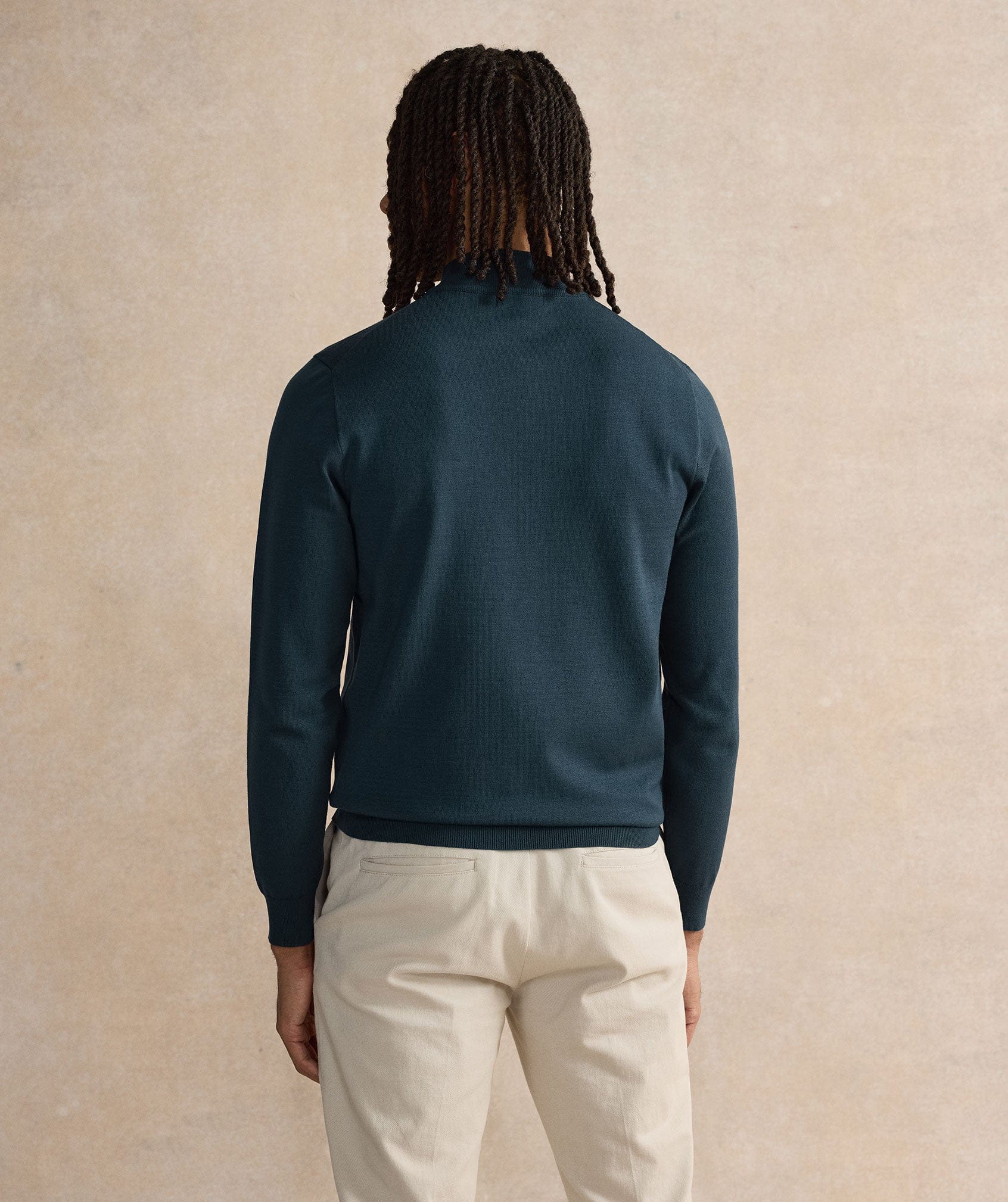 A refined half-zip layer with a clean, structured drape. The soft rayon-nylon blend offers smooth texture and steady shape, ensuring comfort and clarity through the day. A deep navy tone adds quiet depth, making it an easy layer for smart-casual dressing across seasons.