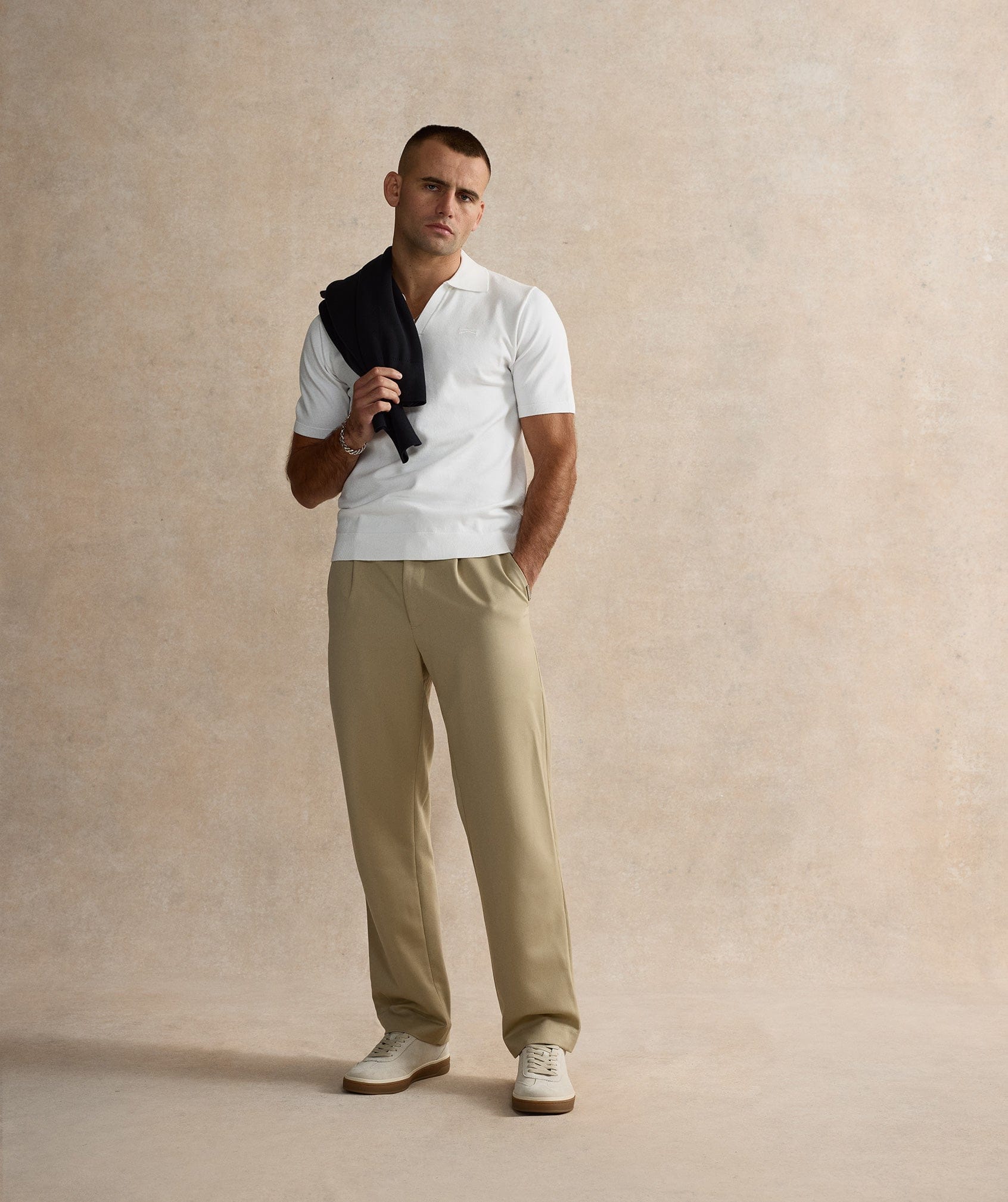 Straight-leg trousers with a clean drape and modern structure. The polyester-rayon blend offers subtle stretch and a smooth, refined feel, keeping the silhouette crisp through everyday movement. A neutral, adaptable staple designed to pair effortlessly with shirts, tees, or knitwear across smart and relaxed settings.
